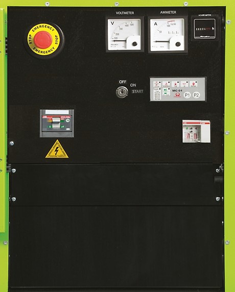 Ręczny panel sterowania na agregacie, wyposażony w analogowe wskaźniki, sterowanie, zabezpieczenia agregatu, zabezpieczony zamykanymi drzwiami.