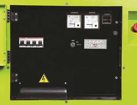 Ręczny panel sterowania na agregacie, wyposażony w analogowe wskaźniki, sterowanie, zabezpieczenia agregatu, zabezpieczony zamykanymi drzwiami.