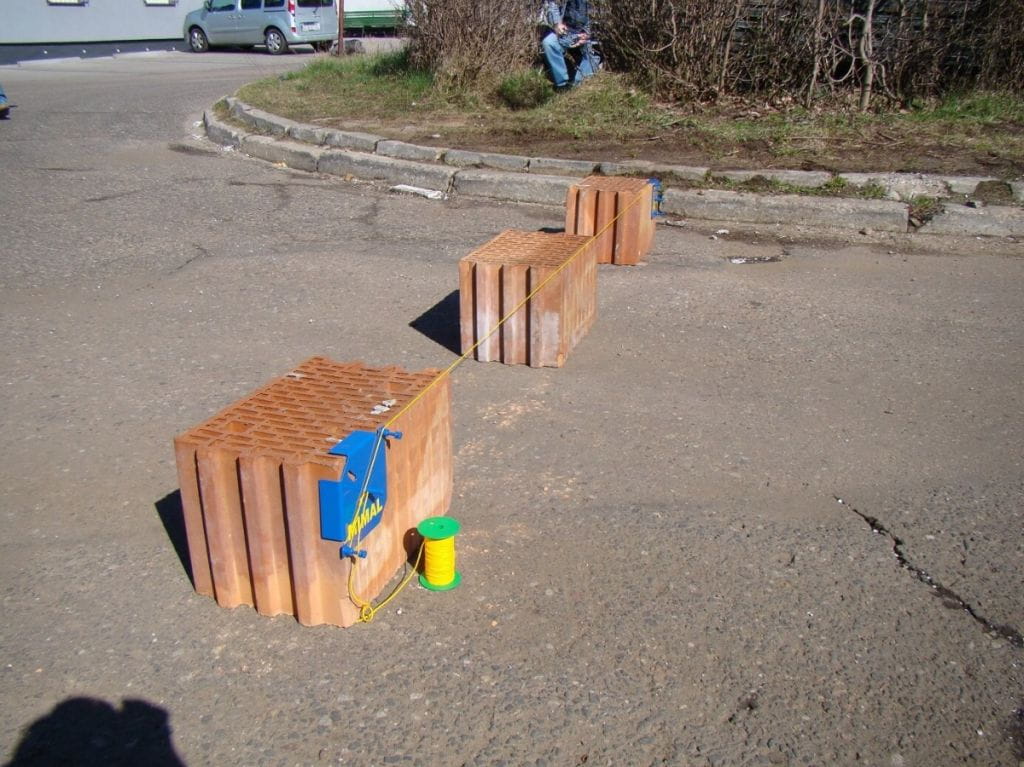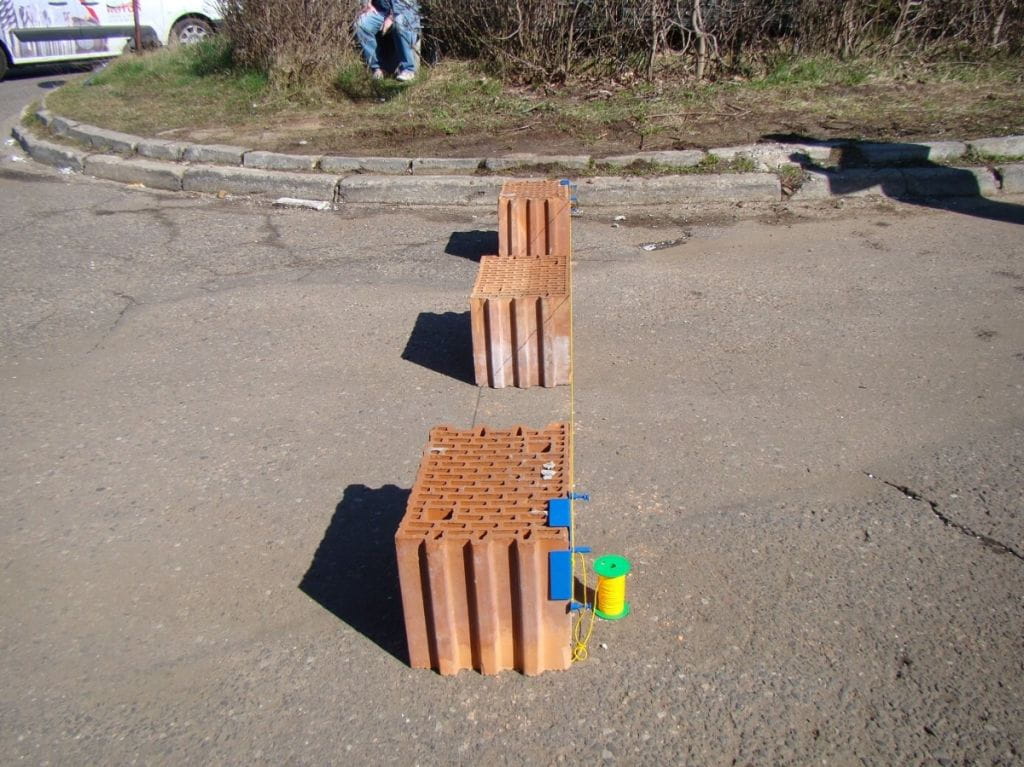 Przyrząd do wytaczania linii prostych podczas układania kostki brukowej, krawężników, a także przy pracach budowlanych (murowanie cegieł czy pustaków). W skład zestawu wchodzą: dwa uchwyty oraz jedna rolka sznurka o grubości 1,4 [mm] i długości 50 [m].