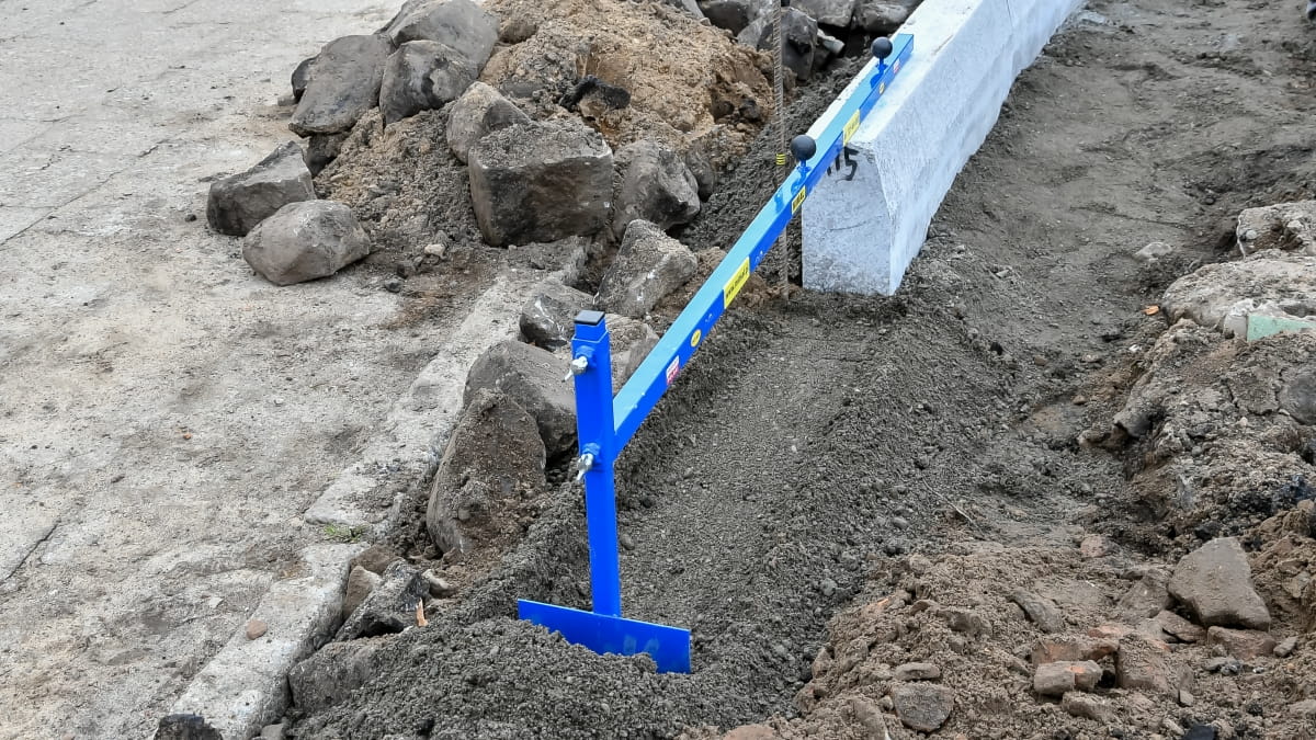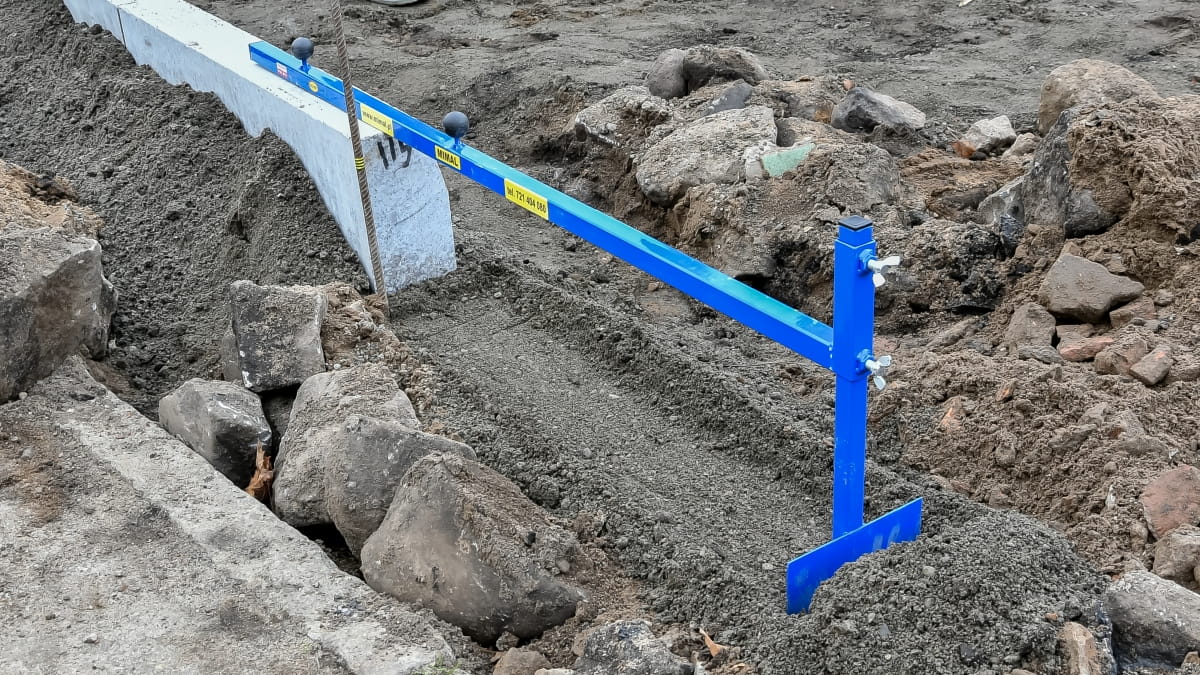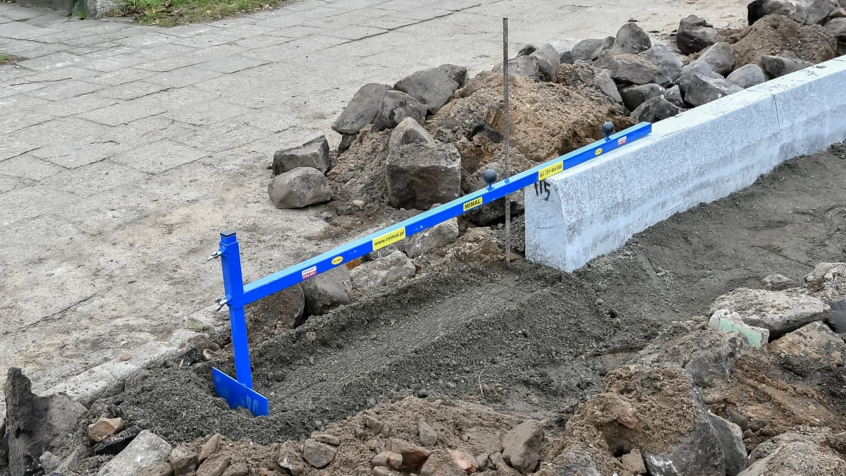 Służy do wyrównywania powierzchni przed kolejno układanymi krawężnikami. Jest to proste narzędzie, które zwiększa wydajność pracy. Posiada płynny zakres regulacji wysokości.