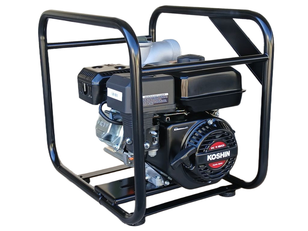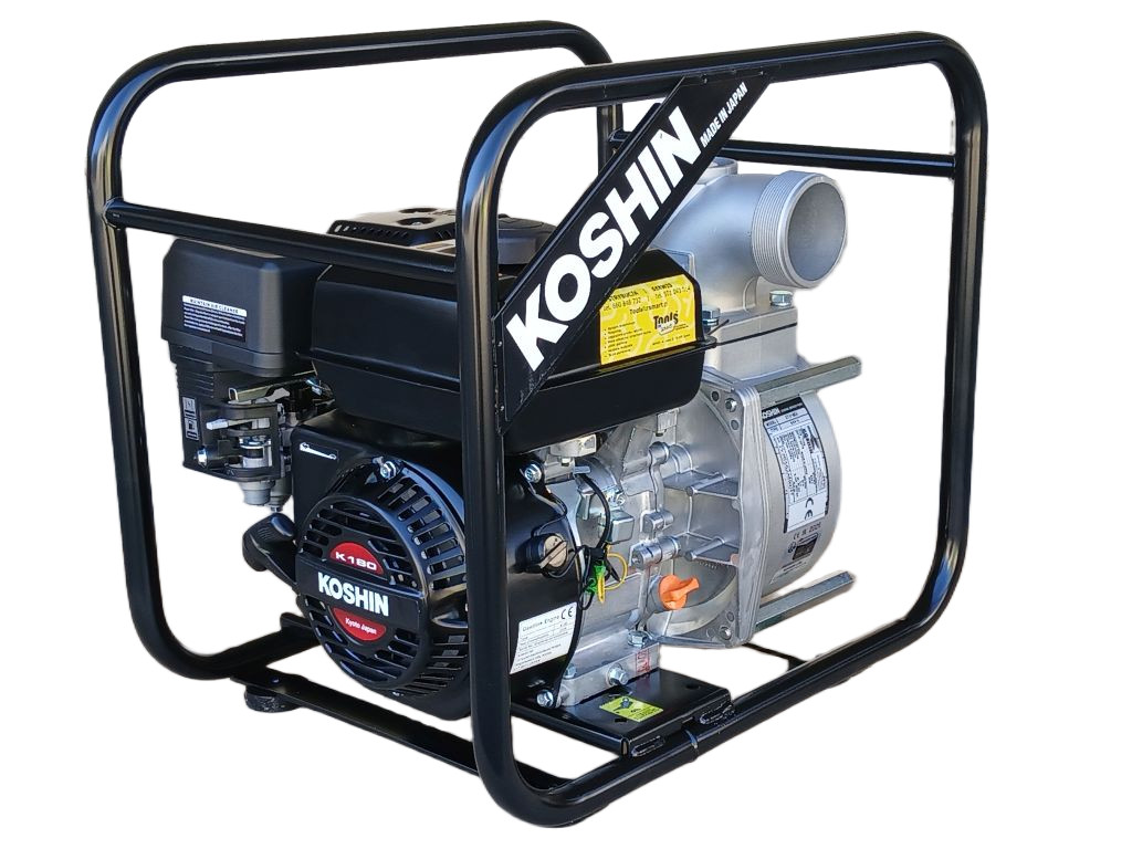 Wysokowydajna motopompa wirnikowa do brudnej wody, lekkiego szlamu / mułu japońskiej firmy KOSHIN z silnikiem benzynowym KOSHIN K180, do zastosowań budowlanych, prac nawadniających w rolnictwie, robotach wodno-kanalizacyjnych jak i w akcjach strażackich, podtopieniach itp..