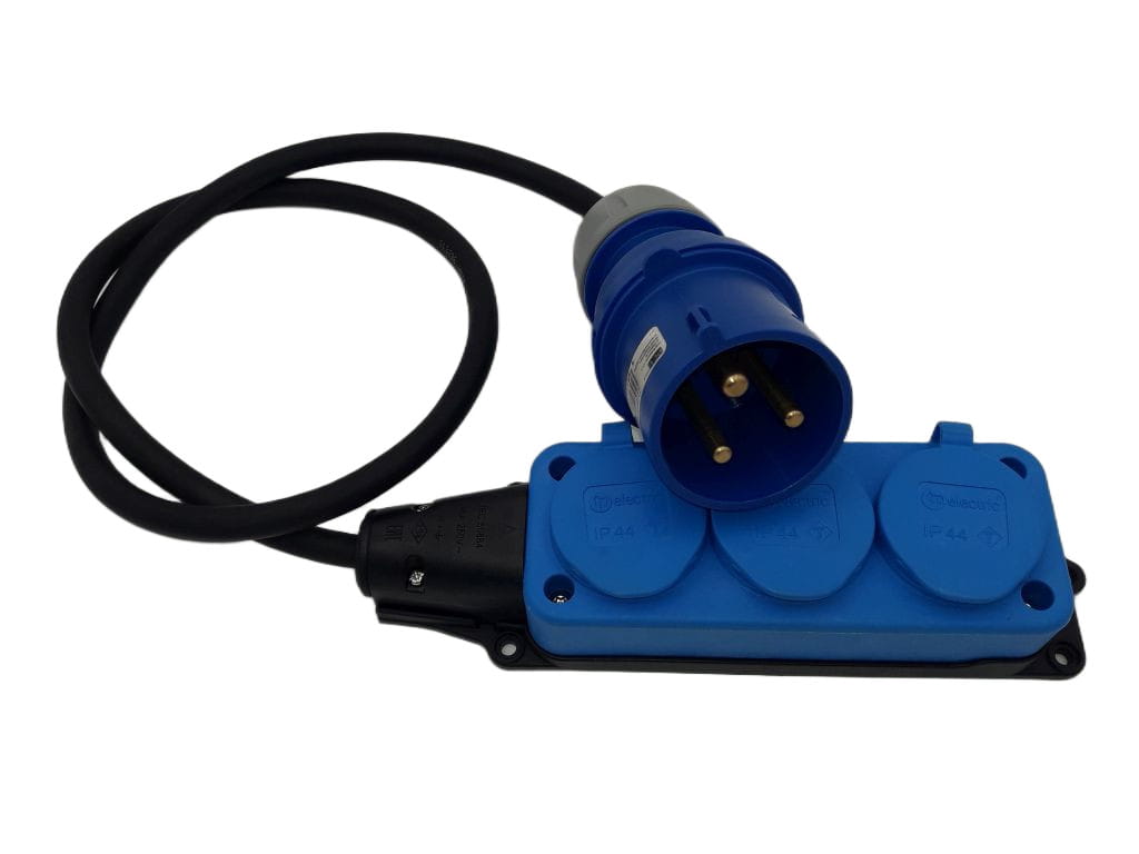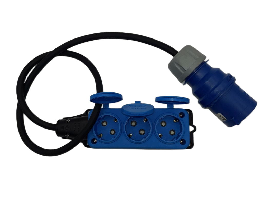 Rozdzielacz prądowy do przenośnych agregatów prądotwórczych w których zastosowano jednofazowe (230V ) wysokoamperażowe (32A) gniazdo odbioru mocy.