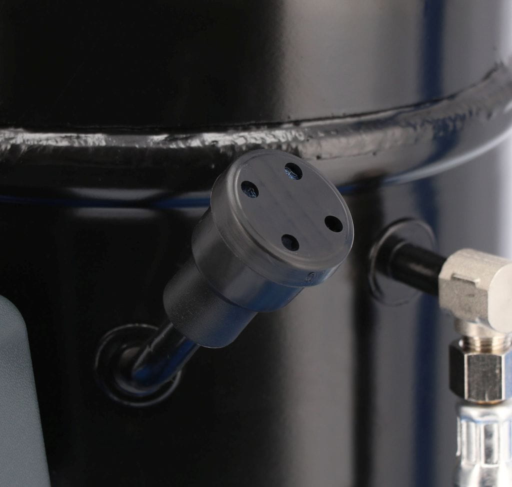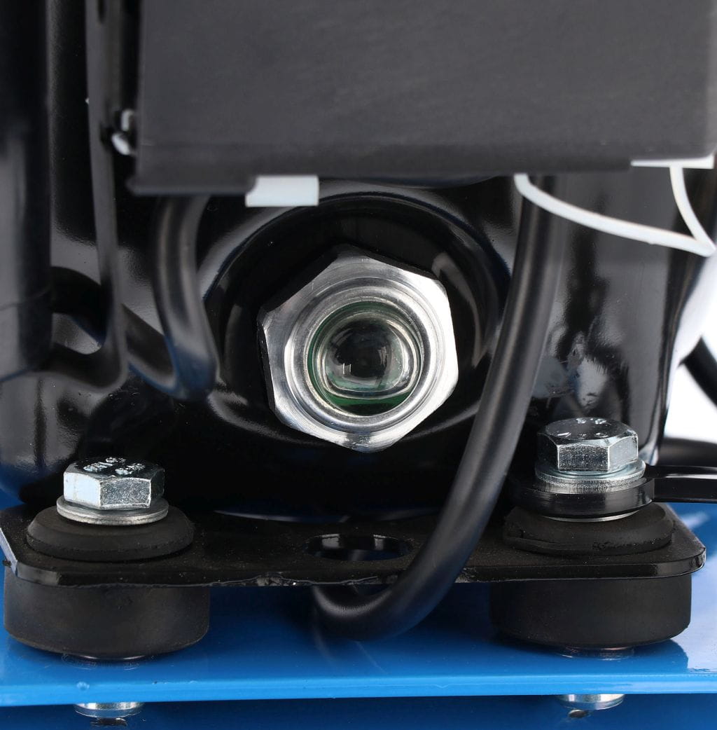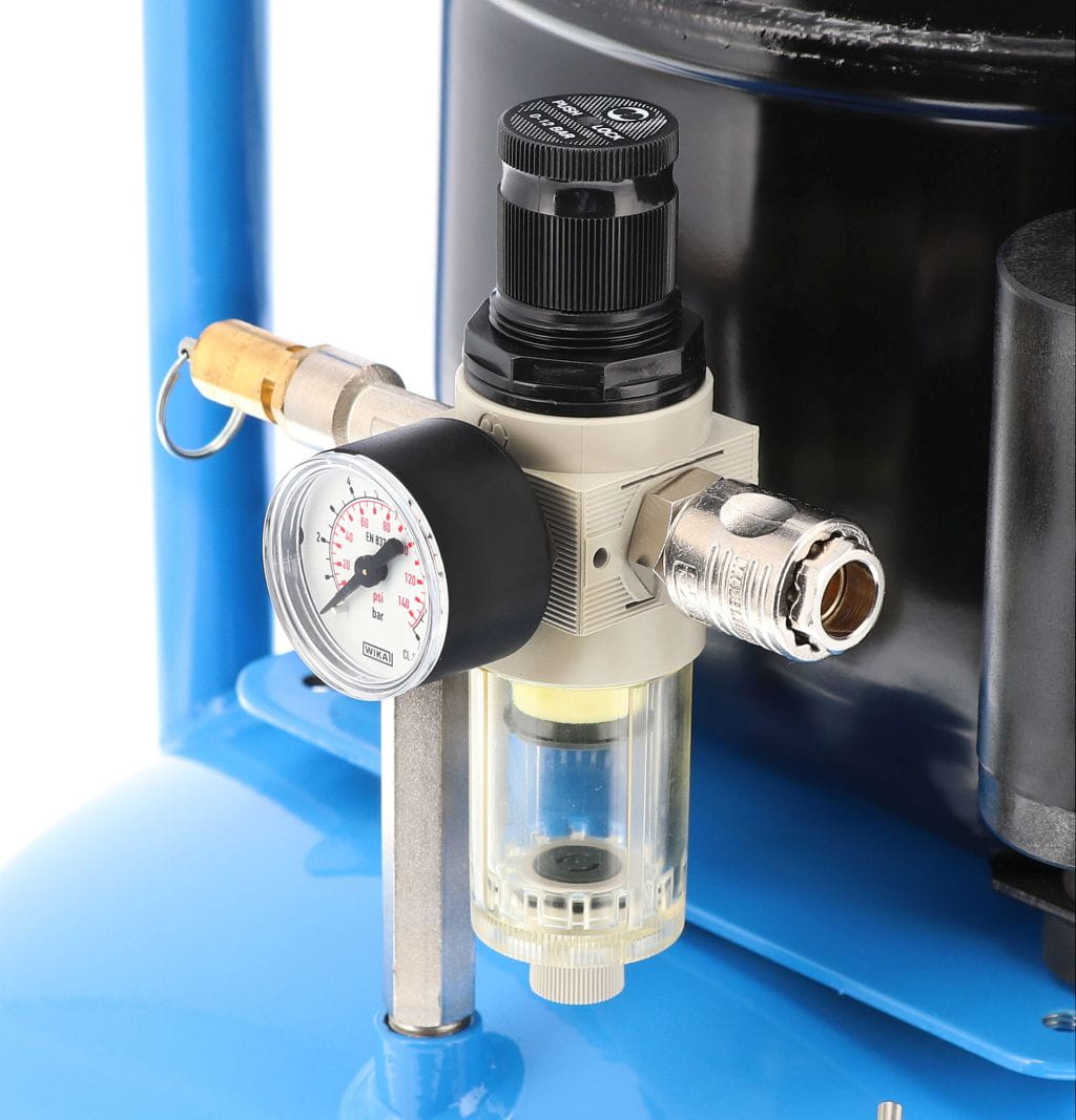 Dla pełnej satysfakcji użytkownika kompresor został wyposażony w manometr, szybkozłącze pneumatyczne, reduktor z filtrem, wyłącznik ciśnieniowy oraz zabezpieczenie termiczne.